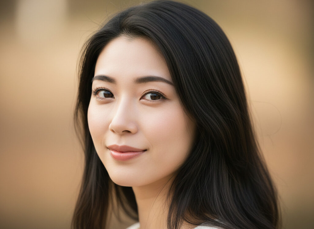 portrait of a beautiful Japanese woman in her mid-20s, natural makeup, soft smile, silky black hair, soft natural lighting, shallow depth of field, photorealistic, high quality, 8k --ar 3:4