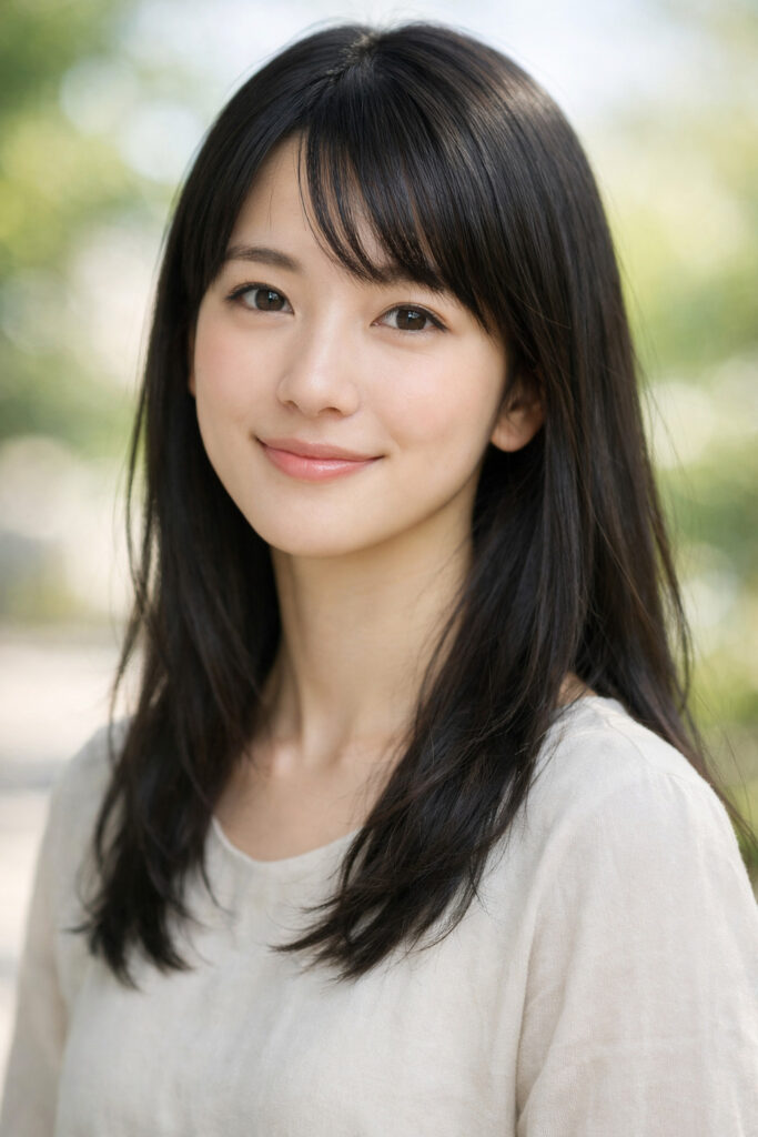 25歳くらいの日本人女性のポートレート写真。ナチュラルメイクで柔らかい微笑みを浮かべている。黒髪のストレートヘアで、自然光のもと、背景はぼかして撮影したような仕上がり。写実的で高画質。縦長の構図。