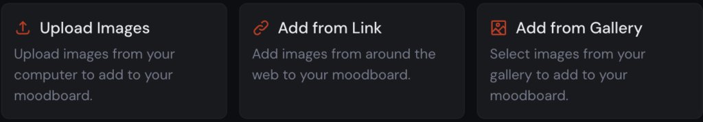 ムードボードに追加する画像は、次の3つの方法から選んでアップロードできます。操作自体はシンプルなので、好きな方法でOKです。