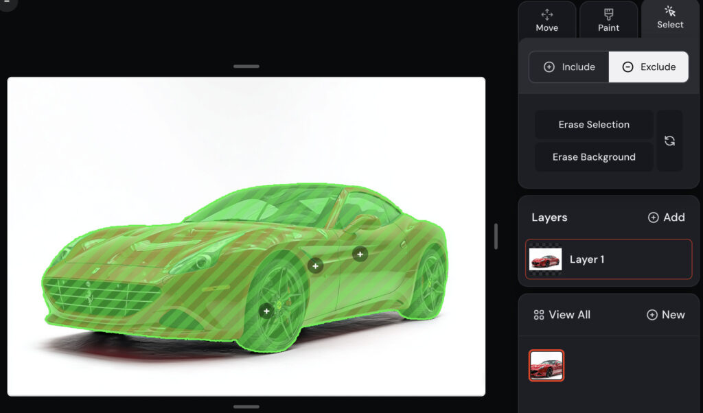 切り抜きたい被写体(例:車)をクリックすると、画像のように緑色のマスクが自動で付き、選択範囲が作られます。
