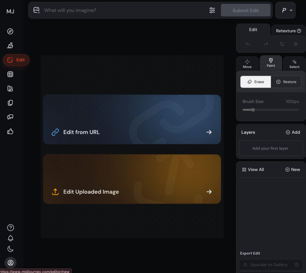 MidjourneyのEditorは、左メニューの「Edit」タブから開く専用画面で使います。
