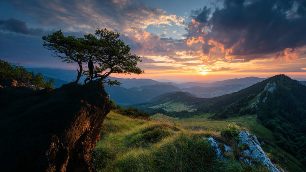 レイヤー1(背景): peaceful mountain landscape at sunset, dramatic sky, wide angle view --ar 16:9