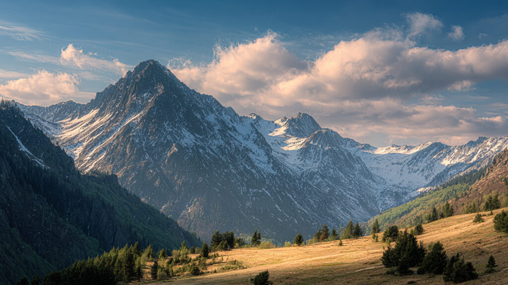 元画像: mountain landscape in summer, blue sky, green trees, sunny day --ar 16:9