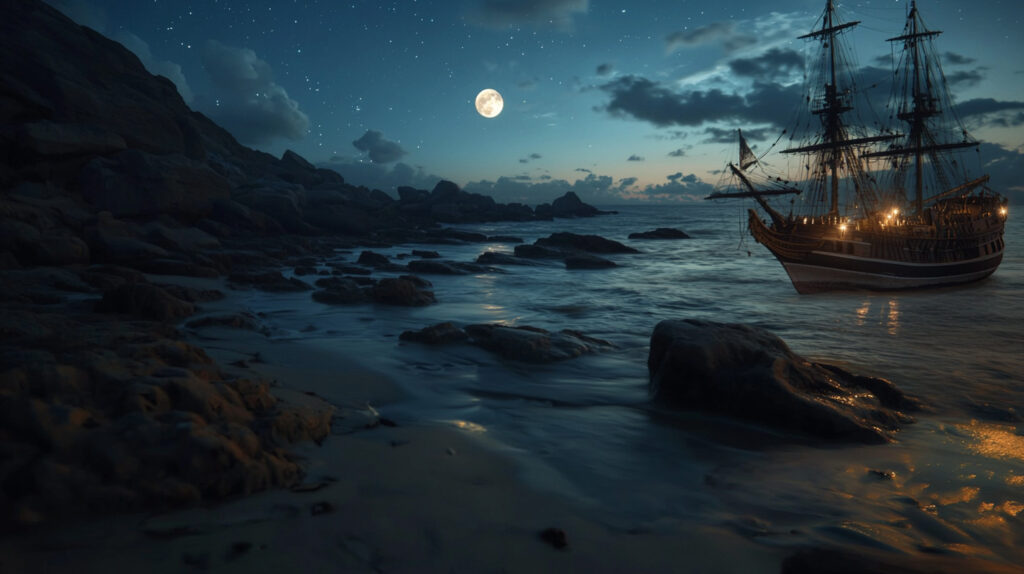 合成後の画像用: ancient sailing ship stranded on rocky beach under starlit night sky, crescent moon, ethereal atmosphere, cinematic lighting, shot with wide angle lensMidjourneyで画像合成する際のコツと注意点