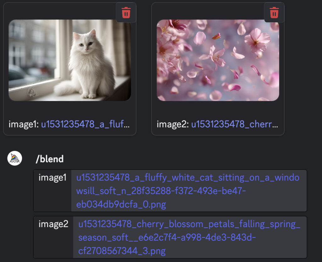 /blend コマンドは「画像だけでざっくり混ぜる」機能でしたが、より細かくコントロールしたいときは、画像URLとテキストプロンプトを組み合わせる方法が便利です。