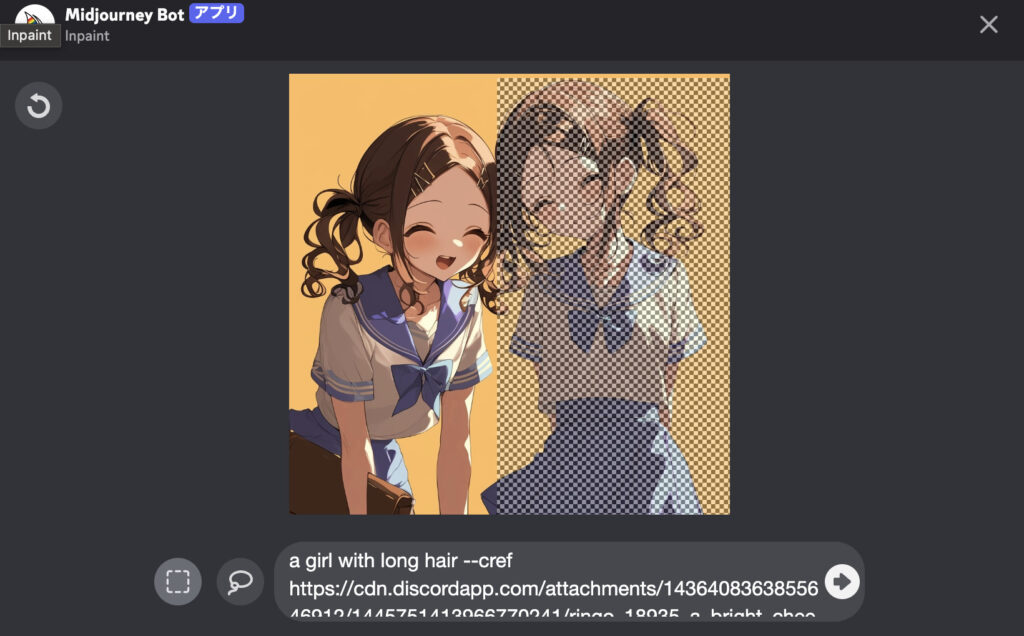 「この位置のキャラだけ、別の子に差し替えたい」というときは、Region Varyで範囲を選んだうえで、プロンプト側に –cref で差し替えたいキャラの画像URLを指定します。