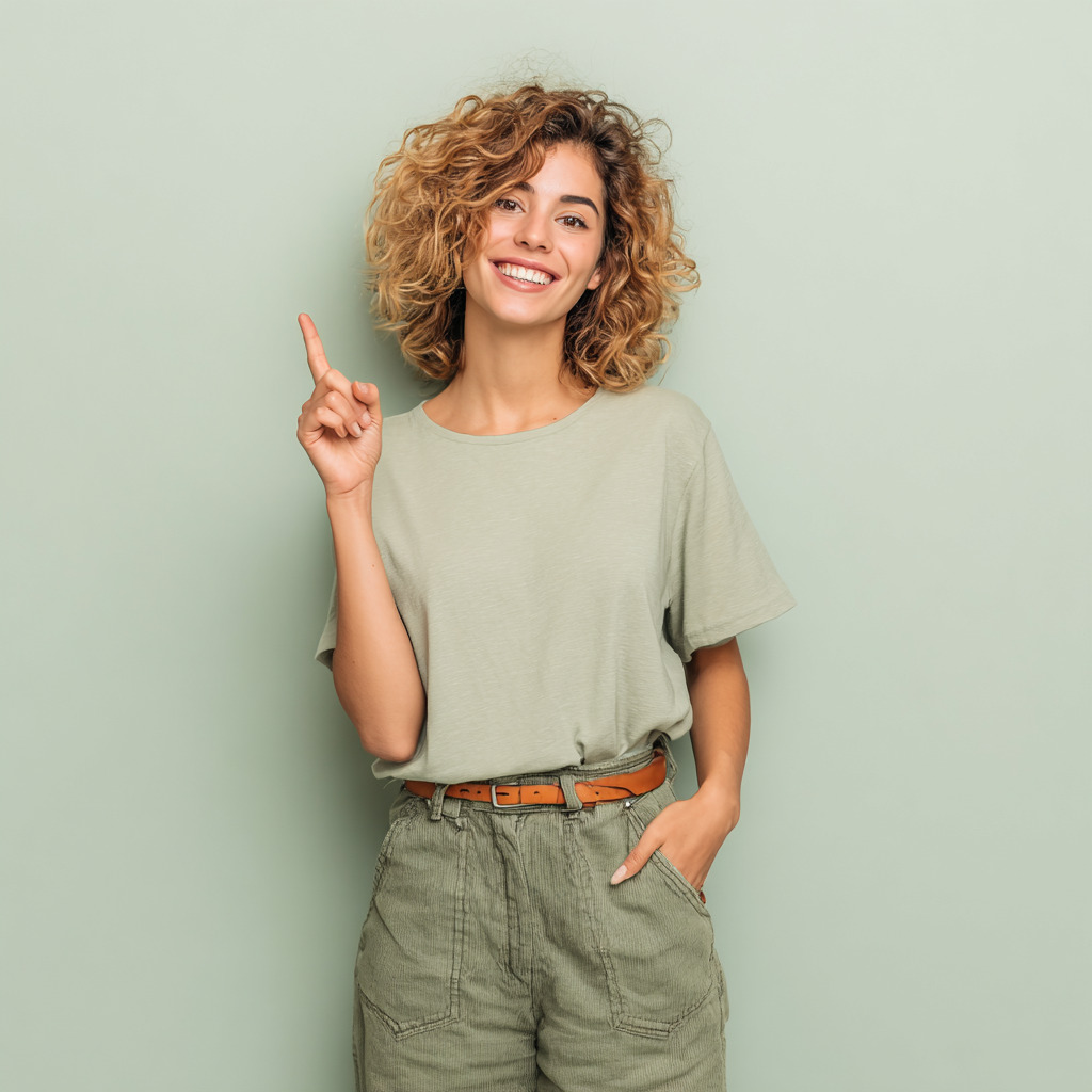 A young woman standing in front of a plain pastel background, smiling at the camera, right hand raised with index finger pointing up, casual outfit, soft natural lighting, realistic photograph修正後