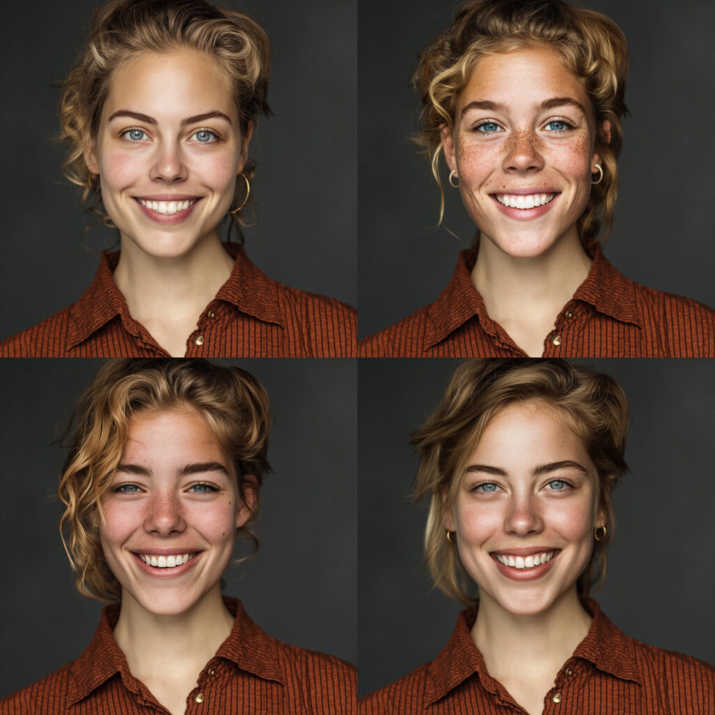 Portrait of a young woman with long blonde hair, bright smile, blue eyes, realistic style, professional photography【実践例②】手や指を修正する