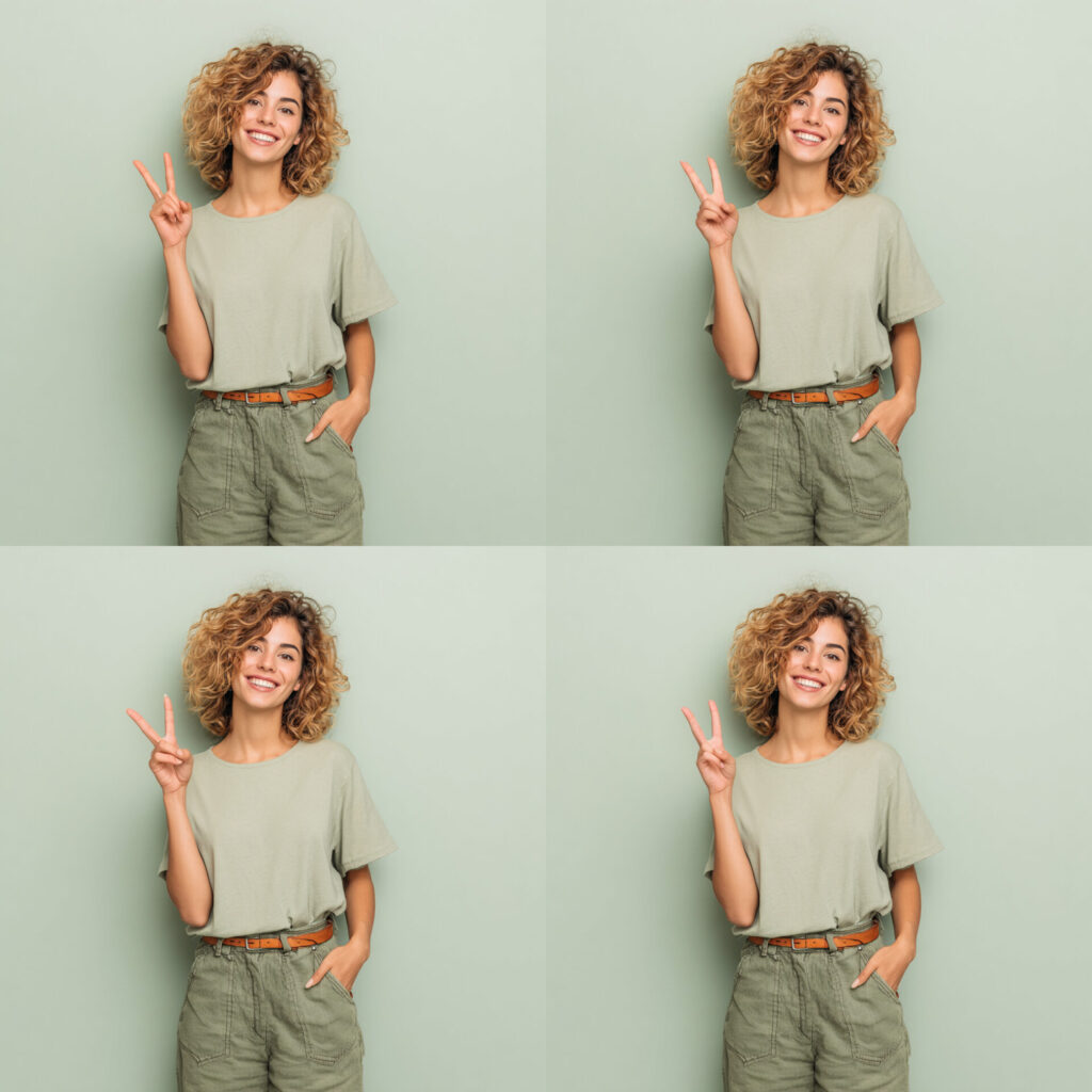 right hand making a peace sign (V sign), index and middle finger raised together, other fingers folded, five fingers clearly visible, realistic hand anatomy, no extra fingers【実践例③】背景だけを変更する