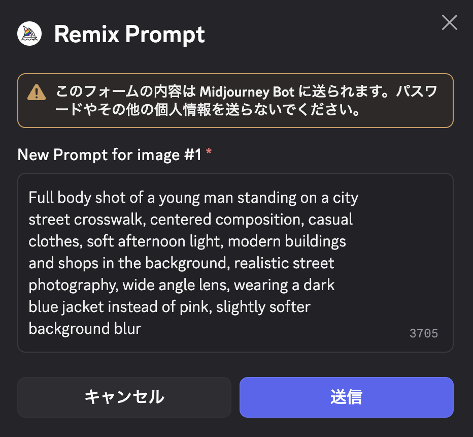 上で紹介した「Vary(Strong/Subtle)で全体調整」中の画像例では、このRemix modeを使ってプロンプトを少し書き換えながらバリエーションを出しています。
