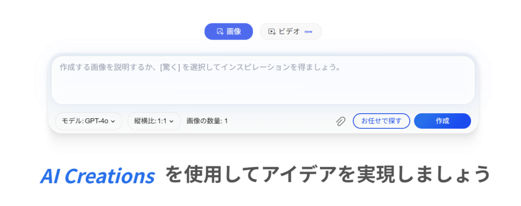 しかも、「お任せで探す」機能を使えば、AIが自動でプロンプトを生成してくれます。「何を作ればいいかわからない…」という初心者の方でも、すぐにクオリティの高い画像を作れちゃいますよ!