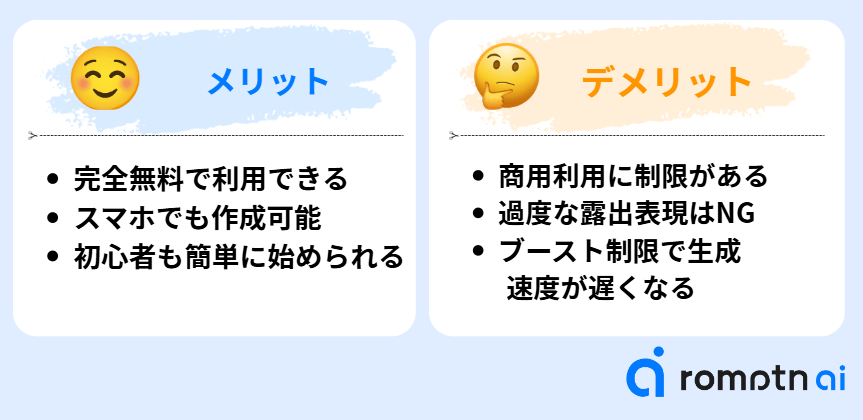 ただし、AIが生成した画像である以上、商用利用や著作権の問題には注意が必要です。この点については、後ほど詳しく解説していきますね。