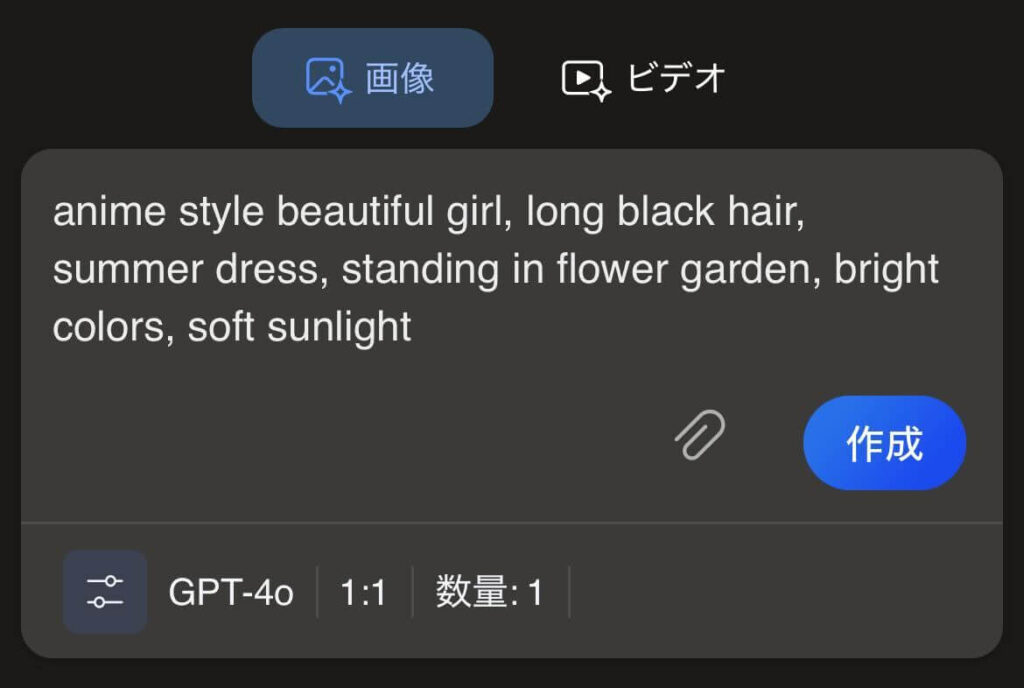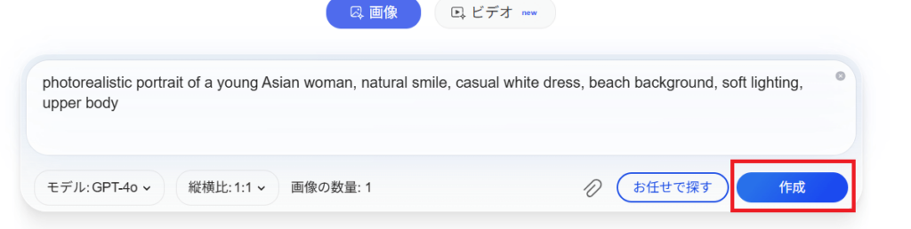 画面上部にある入力欄にプロンプトを入力して、「作成」ボタンを押せば画像生成が始まります!