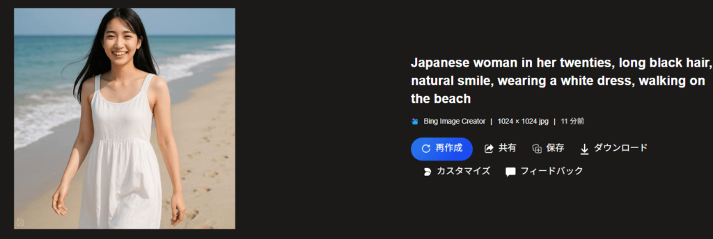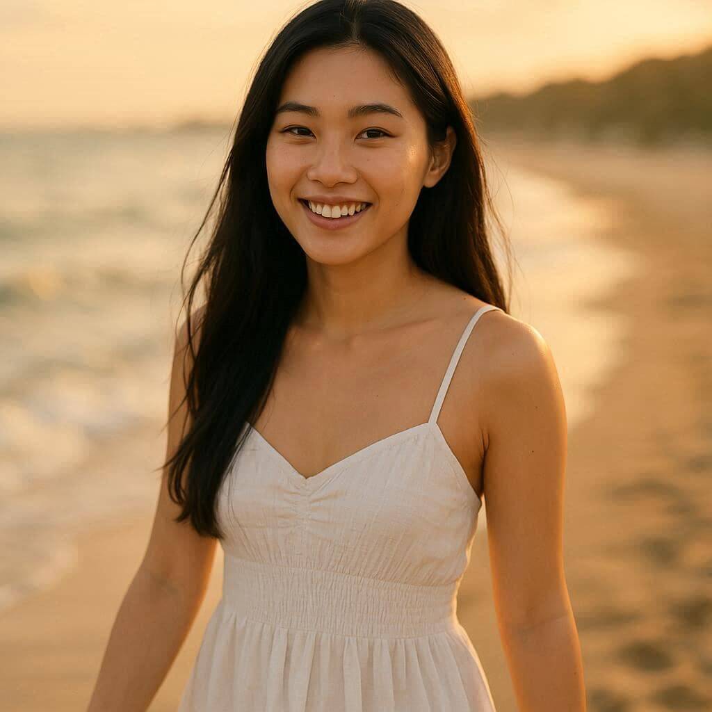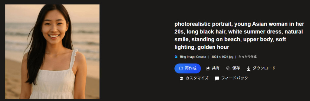 ⭕ 良い例:「20代の日本人女性、長い黒髪、自然な笑顔、白いドレスを着て、ビーチで歩いている」