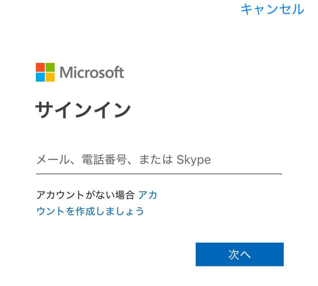 Microsoftアカウントを持っていない方は、この段階で無料で作成できます。メールアドレスとパスワードを設定するだけなので、数分で完了しますよ!