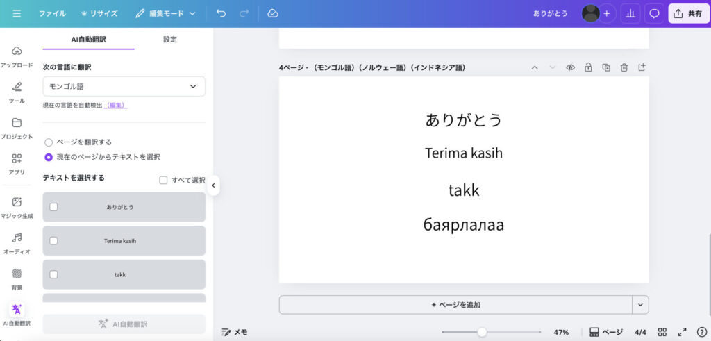 Canva AIには、デザイン内のテキストを自動翻訳する機能(有料プランのみ)も搭載されています。多言語展開が必要なポスターやSNS投稿、プレゼン資料などを効率的に制作できます。