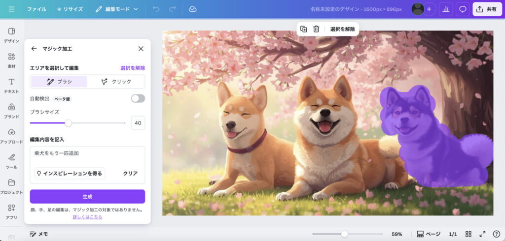 生成された画像は、そのままデザインに配置したり、Canvaの編集機能で加工したりできます。ポイントは、具体的で詳細なプロンプトを入力すること。「犬」だけでなく、「柴犬が桜の木の下で笑顔で座っている、春の日差し、写真風」のように詳しく指定すると、イメージ通りの画像が生成されやすくなりますよ。