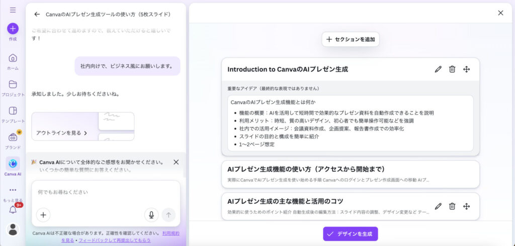 AIからの質問に答えながら資料のイメージを伝えていきます。その後、AIが構成を自動生成してくれるので、テキストを編集しましょう。