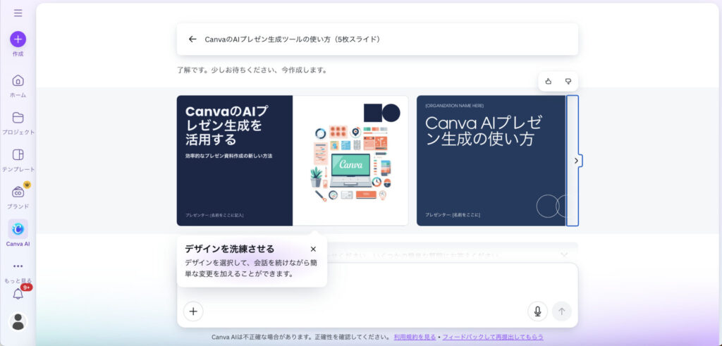 - CanvaのAIスライド生成はAIが自動でプレゼン資料を提案してくれる超便利な機能