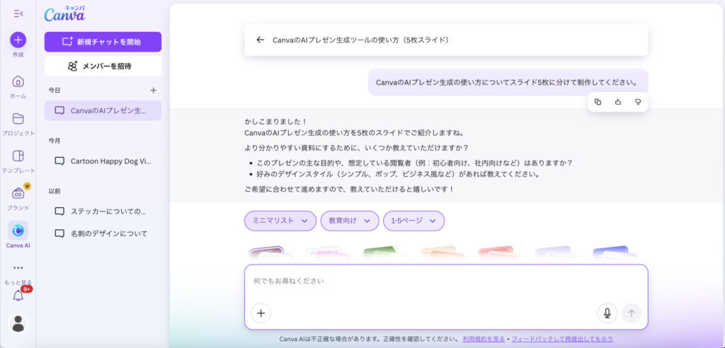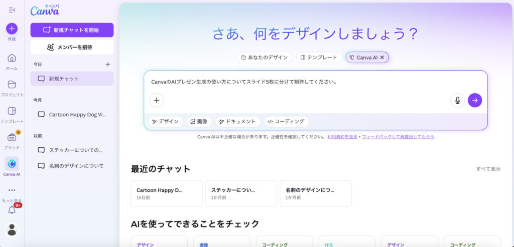 ログイン後、ホーム画面からCanva AIにプレゼンのテーマやキーワードを伝え、「スライドを制作したい」などのプロンプトを入力します。