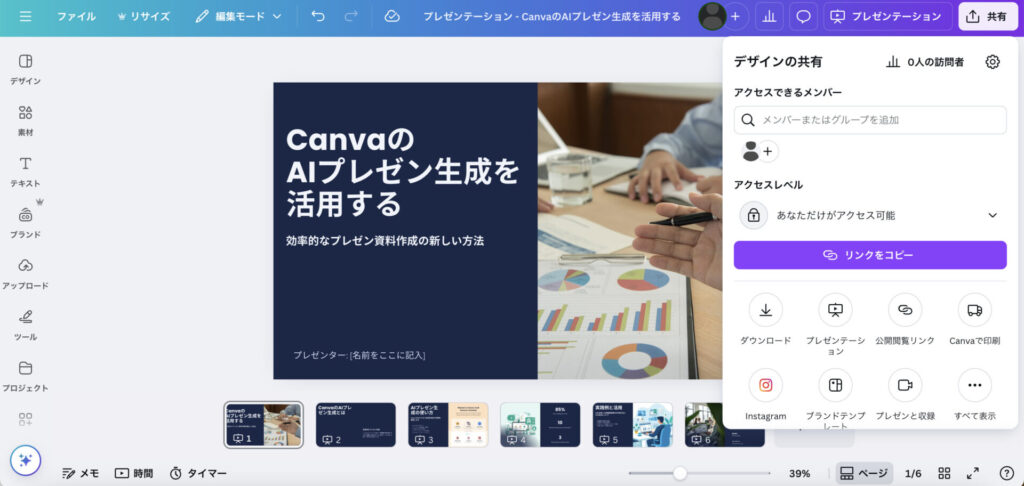 ビジネス用途ではPDFやPowerPoint形式が一般的です。ダウンロードボタンを押せば、作成したスライドが端末に保存され、すぐに使用できる状態になります。