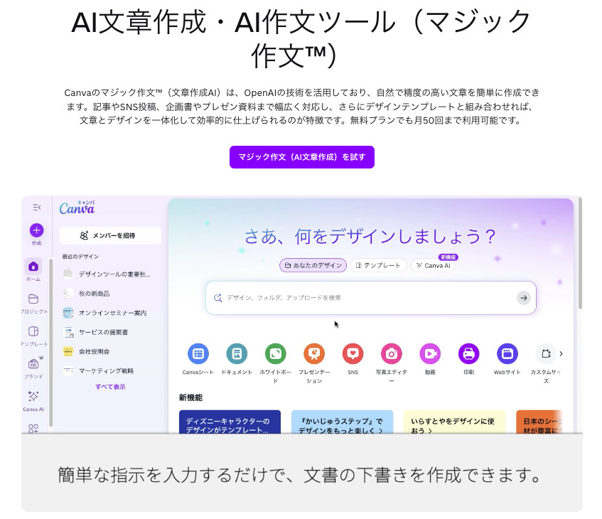 Canvaには複数のAI機能が搭載されており、チラシ制作の中でも特に時間がかかる「文章作成」と「画像素材の準備」を大幅に効率化できます。