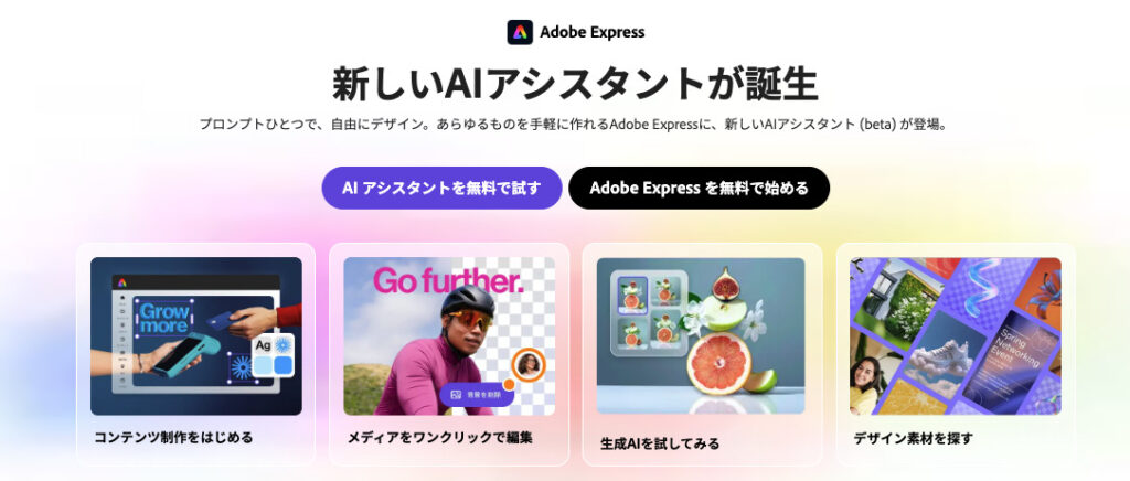 Adobe Expressは、Photoshopやillustratorで知られるAdobe社が提供するオンラインデザインツールです。画像生成AI「Adobe Firefly」が統合されており、テキスト入力だけで商用利用可能な高品質画像を生成できるのが最大の特徴です。