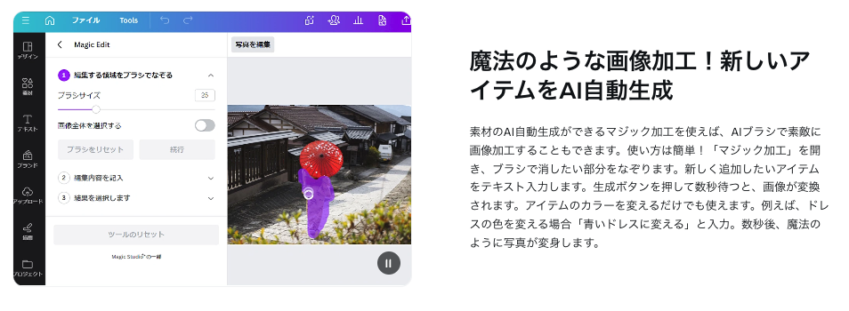 マジック加工機能では、画像の明るさ調整や色味の変更、不要な部分の削除などをAIが自動で提案してくれます。 専門的な画像編集ソフトを使わなくても、プロ品質の加工が可能になります。