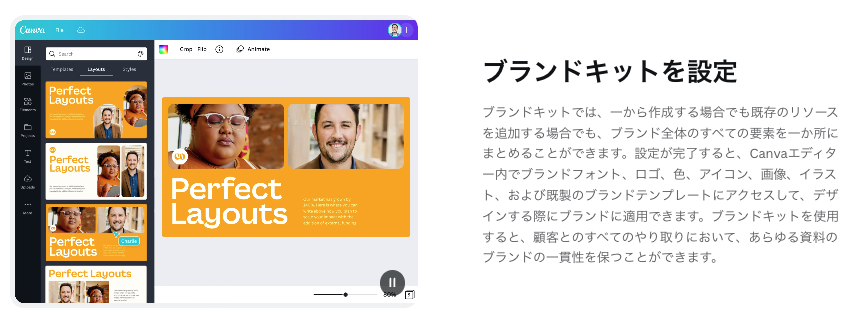 - ブランドキット:登録したロゴ・カラー・フォントをAIが自動反映し、どの資料やSNS画像でも統一感のあるビジュアルを実現できる