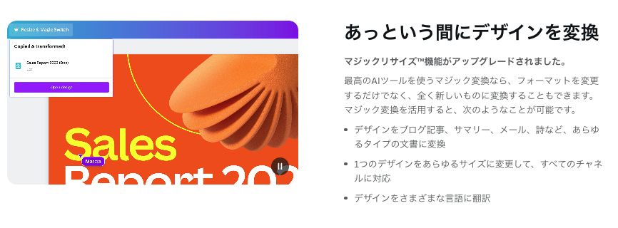 膨大なデザインデータから学習したパターンをもとに色やフォント、レイアウトなどの要素を自動的に組み合わせるため、デザイン初心者でもプロフェッショナルな仕上がりを実現できます。