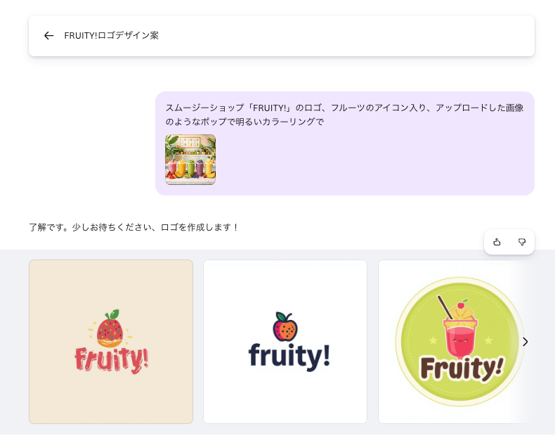 デザインが気に入らない場合は、プロンプトを修正して再生成することも可能です。「もっとシンプルに」「色を赤系に変更」といった追加指示を入れることで、イメージに近づけます。