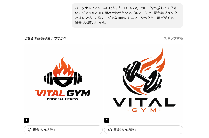 - 日本語の会話形式で指示できる:「パーソナルジムのロゴを作って。色はオレンジと黒で」のように、自然な日本語で依頼できる