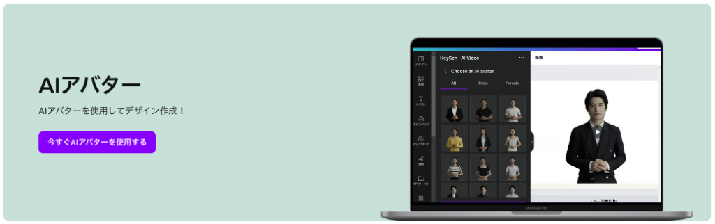 Canvaはアバター動画を制作できるAI映像生成プラットフォームと連携が可能です。Canvaから直接機能を呼び出してアバター動画を生成、さらにそのままCanvaでデザイン編集できる点が最大の魅力。