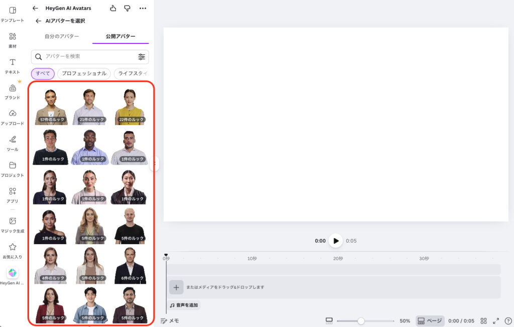 ただし、アジア人の選択肢はやや少ないという声もあるため、日本人向けコンテンツを作る際は、用意されたアバターの中からイメージに近いものを探す必要があります。アバターは「See all」ボタンから一覧で確認でき、プレビューを見ながら選択できるため、事前にどんなアバターが使えるか把握しておくと良いでしょう。