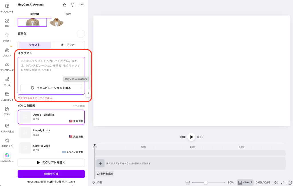 アバター選択後、「Script」と書かれた入力欄にアバターに喋らせたいセリフを日本語で入力します。テキストは自由に記述できますが、句読点や改行を適切に使うことでより自然な喋り方に調整されます。