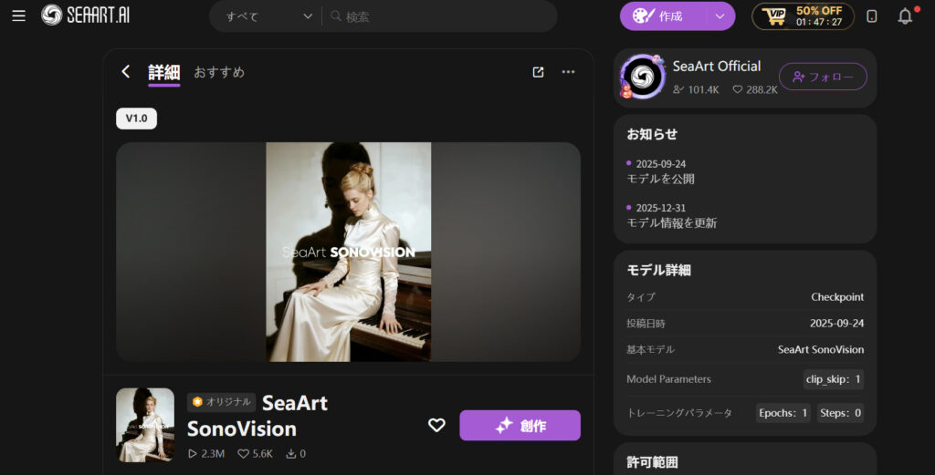 先ほどリスクの章でも触れた通り、SeaArtではすべてのモデルが商用利用できるわけではありません。そのため、生成した画像や他のユーザーの作品を利用する前に、「商用利用が可能かどうか」を必ず確認することが重要です。