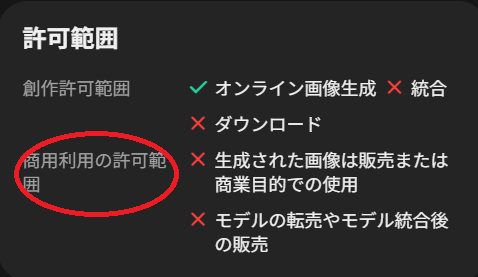 - 生成した画像の商用利用は可能だが、他人の作品やLoRAの利用には注意が必要