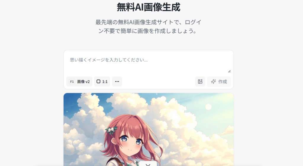 AIGAZOUもまたログイン不要で使えるAI画像生成サイトです。現在は無料プランのみで運営されています。生成された画像は保存可能で、商用利用も可能となっています。