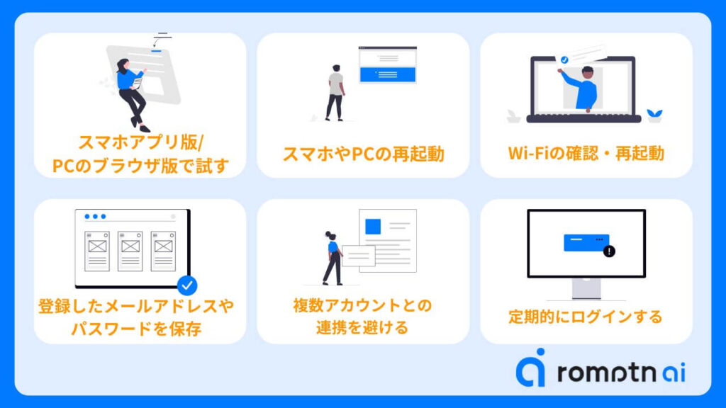 まずは登録時のメールアドレスやパスワードを再度確認し、それでも解決しない場合は公式サポートに相談しましょう。