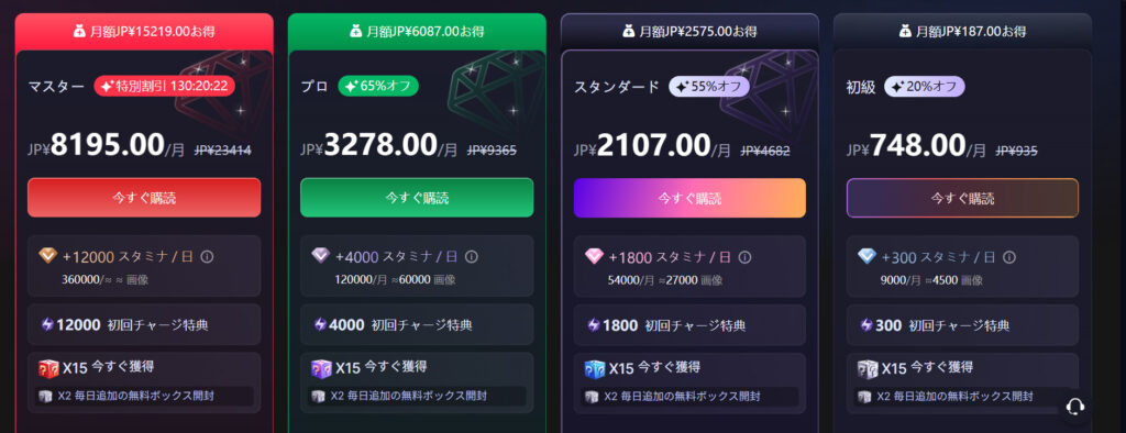 無限に画像を生成できるプランはスタンダード、プロ、マスターです。有料プランに加入することで、生成回数の制限を気にせず画像を作れるようになります。詳しい有料プランも概要を知りたい方は以下の記事をご覧ください。