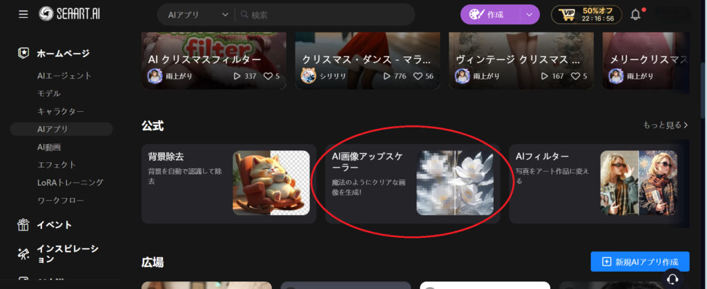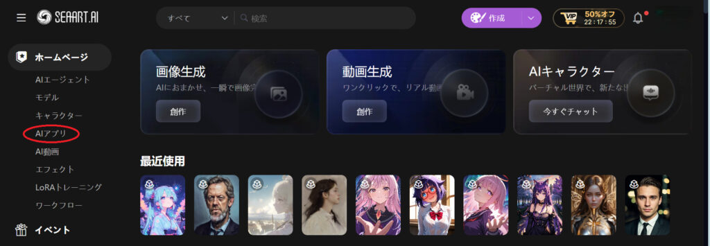 まず、SeaArtの公式サイトにアクセスして、画面上部のメニューから「AIアプリ」を選択します。