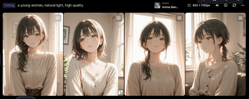 a young woman, natural light, high quality(若い女性、自然光、高品質)優秀なモデルを選んでいれば、短いプロンプトでも十分綺麗な画像が生成できます。