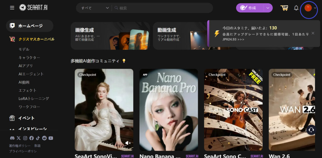- ステップ1SeaArtの公式サイトにログインし、プロフィール画面を開く