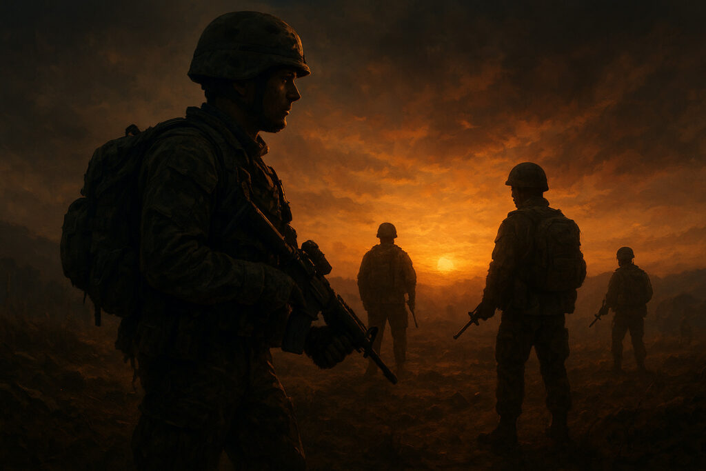 「緊迫した空気の中、兵士たちが夕暮れの荒野に立つ。
