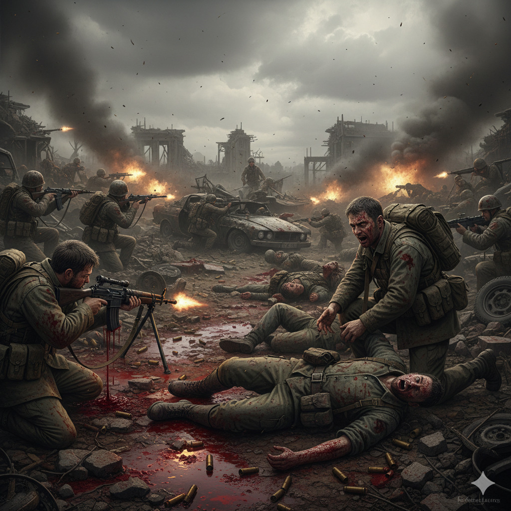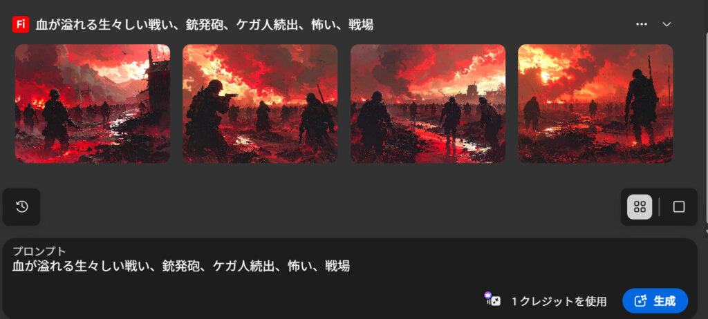 今回使用したプロントは「血が溢れる生々しい戦い、銃発砲、ケガ人続出、怖い、戦場」です。