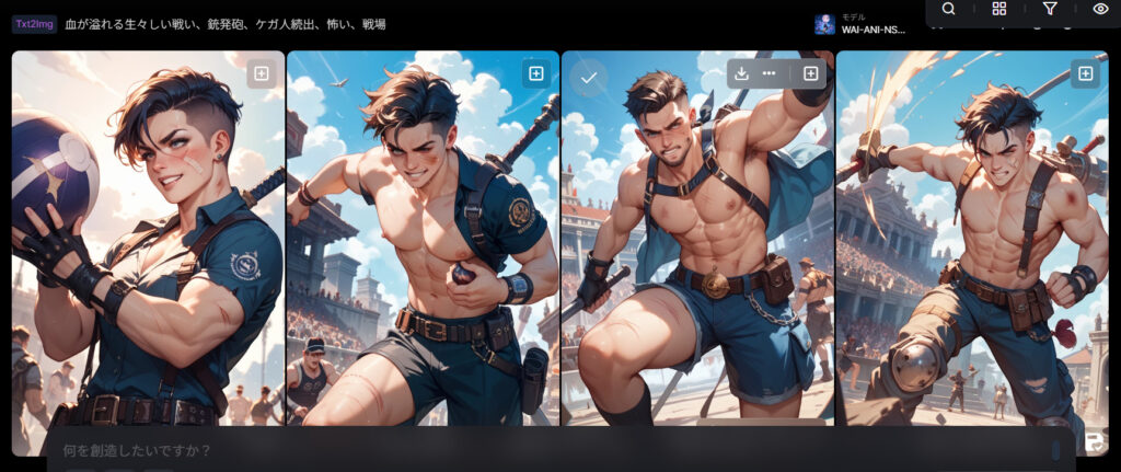 このように、規制はかからずに4枚の画像が出来ました。プロントにある「血が溢れる生々しい戦い」のようには見えませんが、ぼかしなどがかかることはありませんでした!