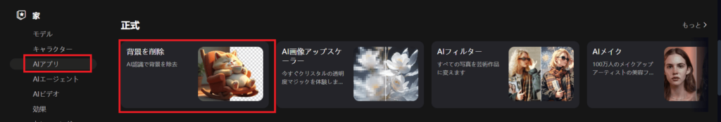 「AIアプリ」という項目の中に「背景を削除」があるので、こちらをクリックします。