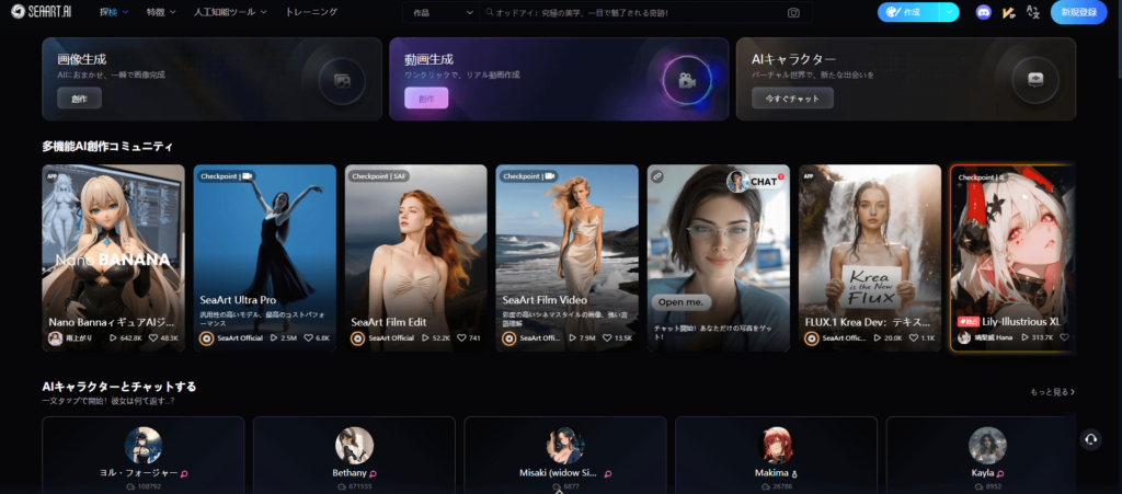 SeaArt AI(シーアート)とはシンガポール発の画像生成AIサービスです。主にテキスト入力や画像入力を元に、画像・動画・音声などを生成できるようになっています。