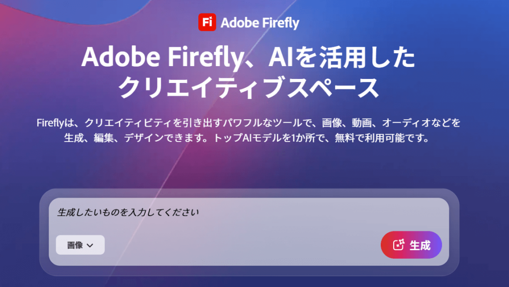 Adobe Fireflyは、アメリカのAdobe社によって開発された生成AIツールです。テキストプロントなどを使用することが出来るため、生成AIで画像を作るのが初めての方でも簡単に画像が作れます。