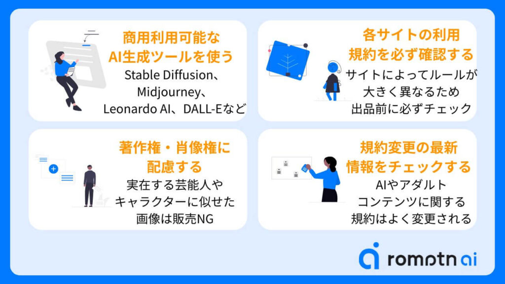 - 商用利用可能なAI生成ツールを使い、各サイトの規約を必ず確認する